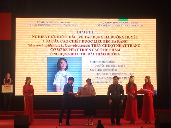 Đề tài đạt Giải nhi Giải thưởng "Sinh viên nghiên cứu khoa học" cấp Bộ năm 2020 có tiêu đề: "Nghiên cứu bước đầu về tác dụng hạ đường huyết của các cao chiết dược liệu Bìm ba răng (Merremia tridentata L., Convolvulaceae) trên chuột nhắt trắng - cơ sở để phát triển các chế phẩm ứng dụng điều trị đái tháo đường" của sinh viên Nguyễn Thị Thuỳ Trang với sự hướng dẫn của giảng viên Nguyễn Dương Ngọc Thới - Khoa Dược.